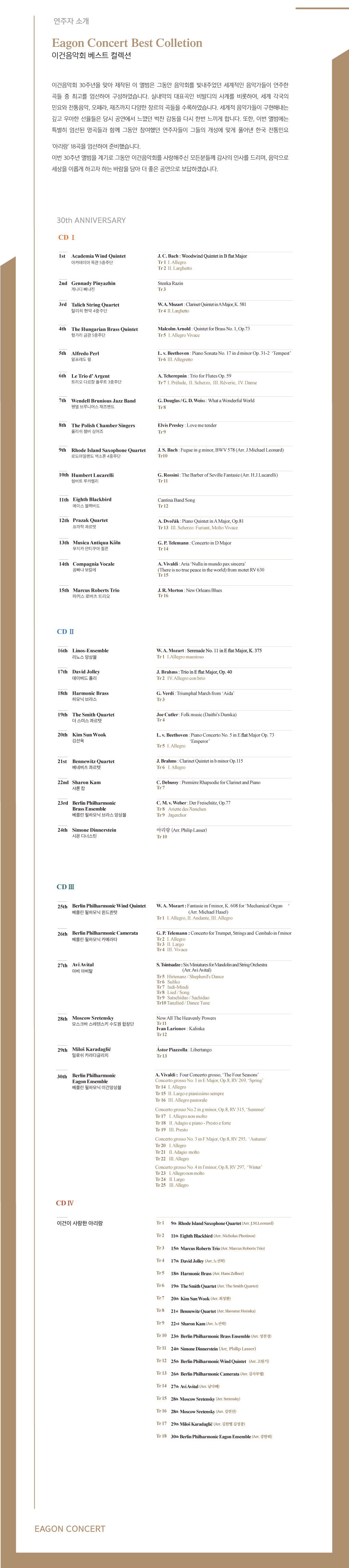 그 뿐만 아니라, 30주년 기념으로 1회~30회 까지의 대표곡들을 선정하여 하나의 앨범으로 구성한 30주년 베스트 앨범도 최근 업로드 하였사오니, 스마트폰이나 컴퓨터로 들어보시면 좋겠습니다.